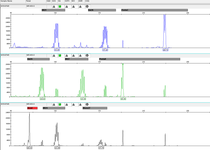 微衛(wèi)星是人類基因組的一段串聯(lián)重復(fù)序列,一般在1~6bp之間,又被稱作短串連重復(fù)(Short Tandem Repeats,STRs)或簡單重復(fù)序列(Simple Sequence Repeat,SSRs)。 微衛(wèi)星不穩(wěn)定(Microsatellite Instability,MSI)指的是微衛(wèi)星重復(fù)次數(shù)減少或者增加,微衛(wèi)星不穩(wěn)定的內(nèi)在機制是錯配修復(fù)(MMR)系統(tǒng)失調(diào),從而限制了糾正微衛(wèi)星自發(fā)的長度改變的體細胞突變的能力,體細胞突變積累,最終形成MSI。