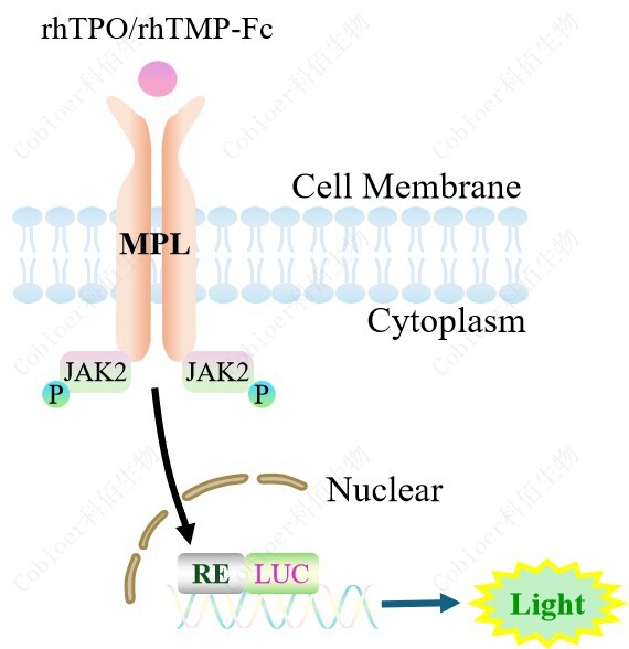 TPO Effector Reporter Cell 報(bào)告基因藥靶模型很好的模擬了體內(nèi) TPO 的信號(hào)轉(zhuǎn)導(dǎo)過(guò)程, 原理見下圖所示。![]() Figure 1. TPO Effector Reporter Cell 細(xì)胞模型原理圖 |