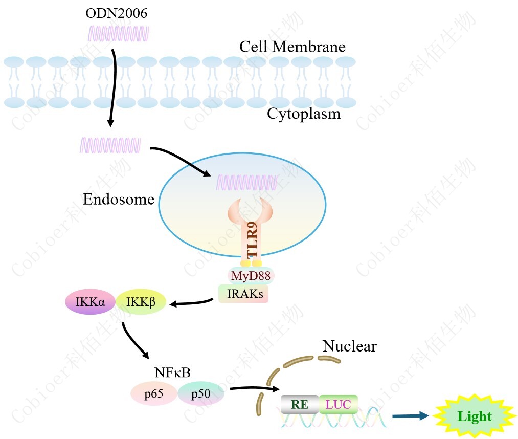 TLR9 NFκB-Luc HEK293 報告基因藥靶模型很好的模擬了體內(nèi) TLR9 的信號轉(zhuǎn)導(dǎo)過程, 原理見下圖所示。