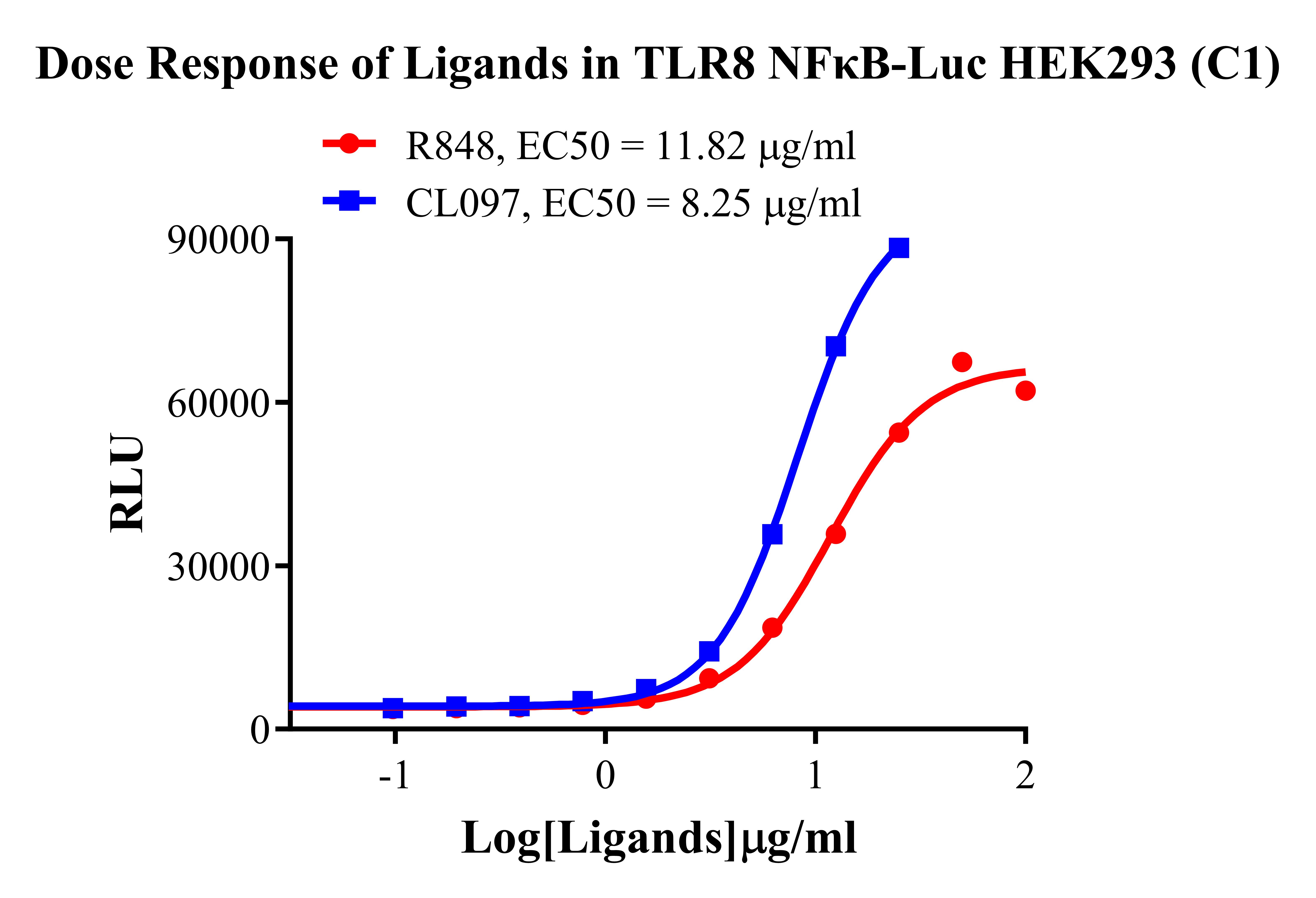 Figure 2. Detect Luciferase assay by Ultra Luciferase Detection Kit CBPH0001(we strongly suggest to purchase from Cobioer). Dose Response of Ligands in TLR8 NFκB-Luc HEK293(C1).