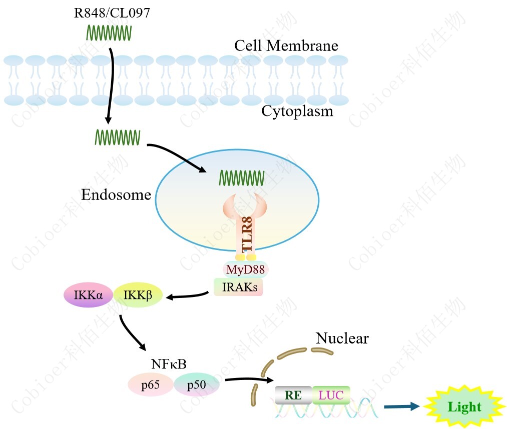 TLR8 NFκB-Luc HEK293 報(bào)告基因藥靶模型很好的模擬了體內(nèi) TLR8 的信號轉(zhuǎn)導(dǎo)過程, 原理見下圖所示。