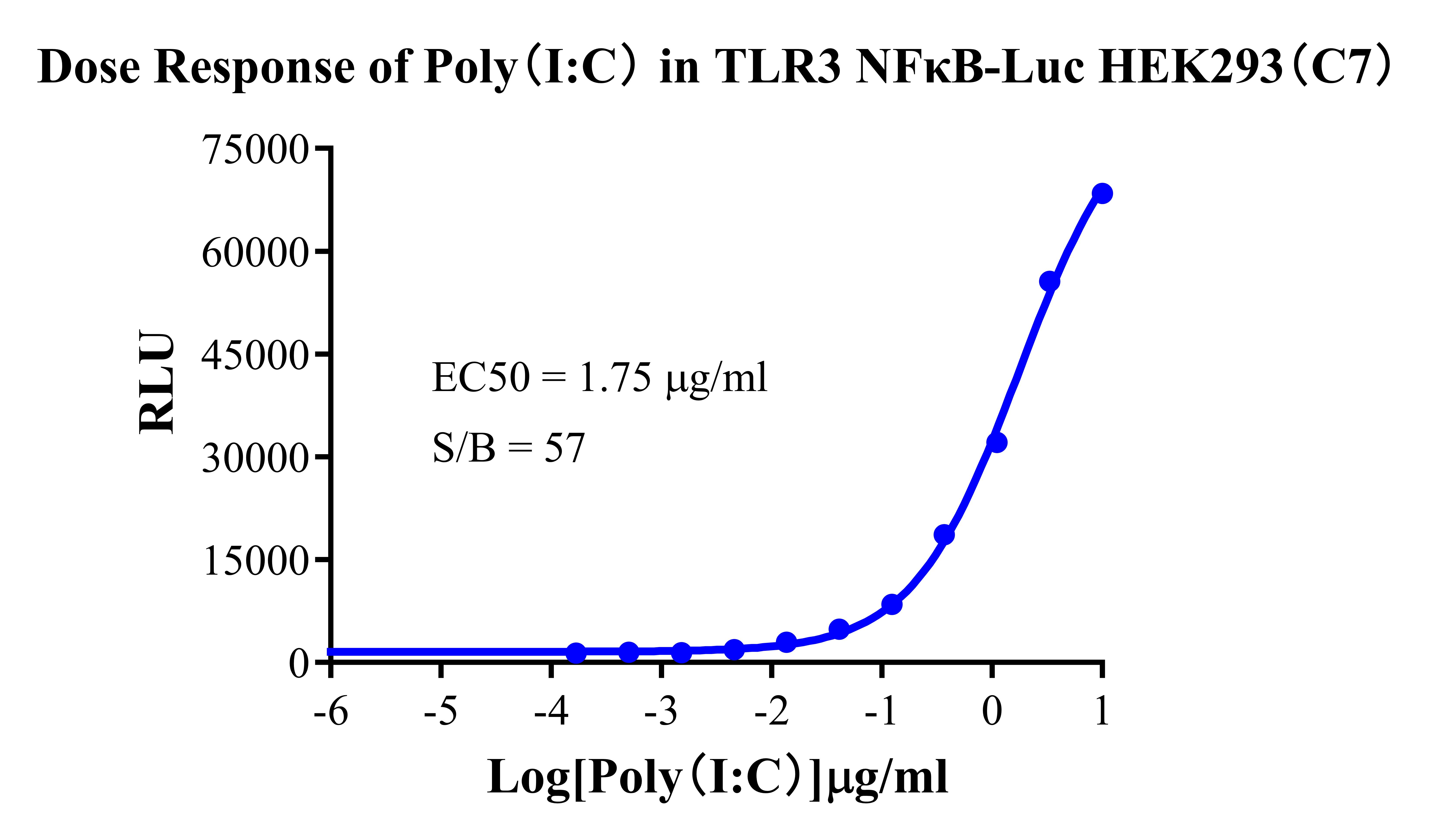 Figure 2. Detect Luciferase assay by Ultra Luciferase Detection Kit CBPH0001(we strongly suggest to purchase from Cobioer). Dose Response of Poly(I:C) in TLR3 NFκB-Luc HEK293(C7).