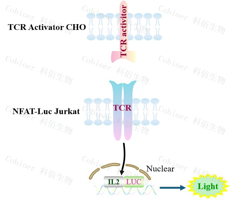 TCR Activator CHO 報(bào)告基因藥靶模型很好的模擬了體內(nèi) TCR 的信號(hào)轉(zhuǎn)導(dǎo)過程,原理見下圖所示。![]() Figure 1. TCR Activator CHO 細(xì)胞模型原理圖 |