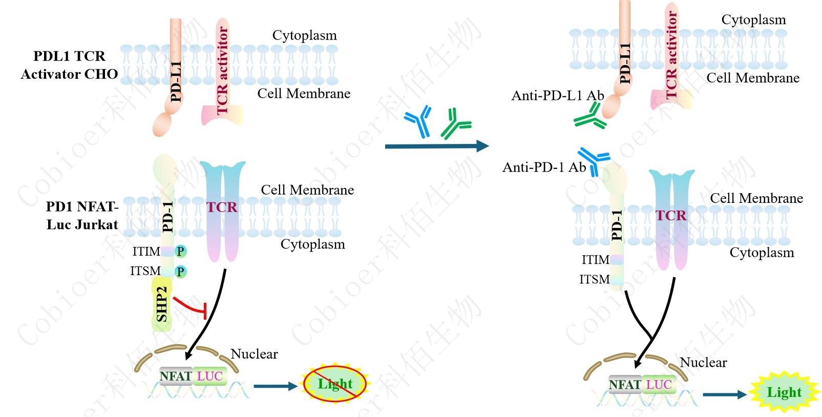 PDL1 TCR Activator CHO 細胞作為 PD1 NFAT-Luc Jurkat 細胞的靶細胞,很好的模擬了 體內(nèi) PD1&PDL1 的信號轉(zhuǎn)導(dǎo)過程,原理見下圖所示。
