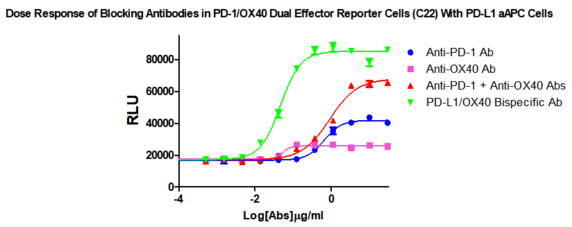 Figure 1. Dose Response of Blocking Antibodies in PD-1/OX40 Dual Effector Reporter Cells (C22) With PD-L1 aAPC Cells.