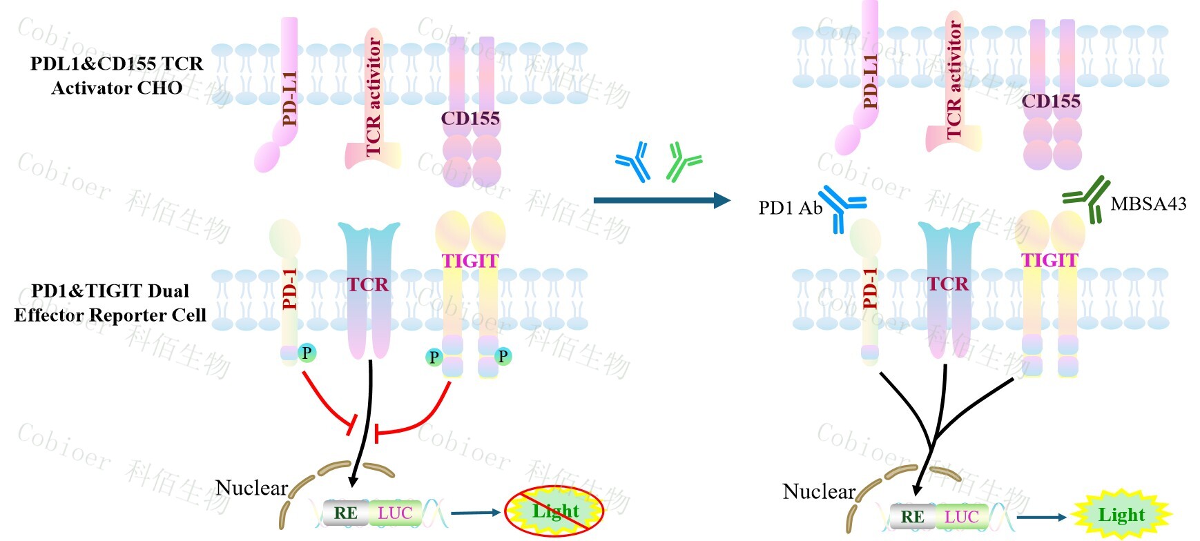 PDL1&CD155 TCR Activator CHO 作為 PD1&TIGIT Dual Effector Reporter Cell 的靶細(xì) 胞,很好的模擬了體內(nèi) PD1&TIGIT 的信號轉(zhuǎn)導(dǎo)過程,原理見下圖所示。