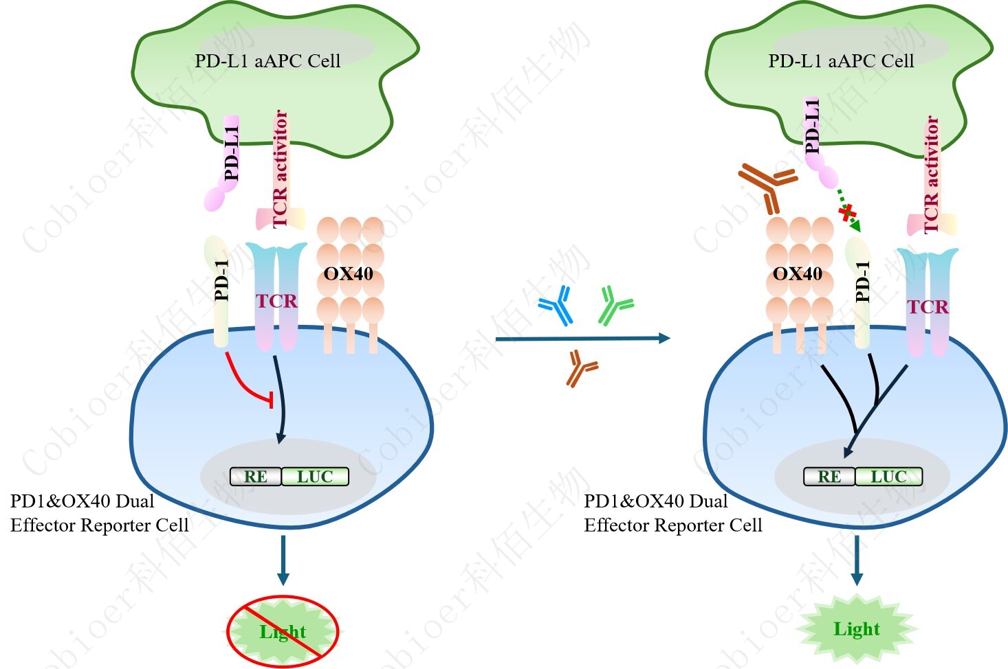 PD1&OX40 Dual Effector Reporter Cell 報(bào)告基因藥靶模型很好的模擬了體內(nèi) PD1&OX40 的信號(hào)轉(zhuǎn)導(dǎo)過程,原理見下圖所示。