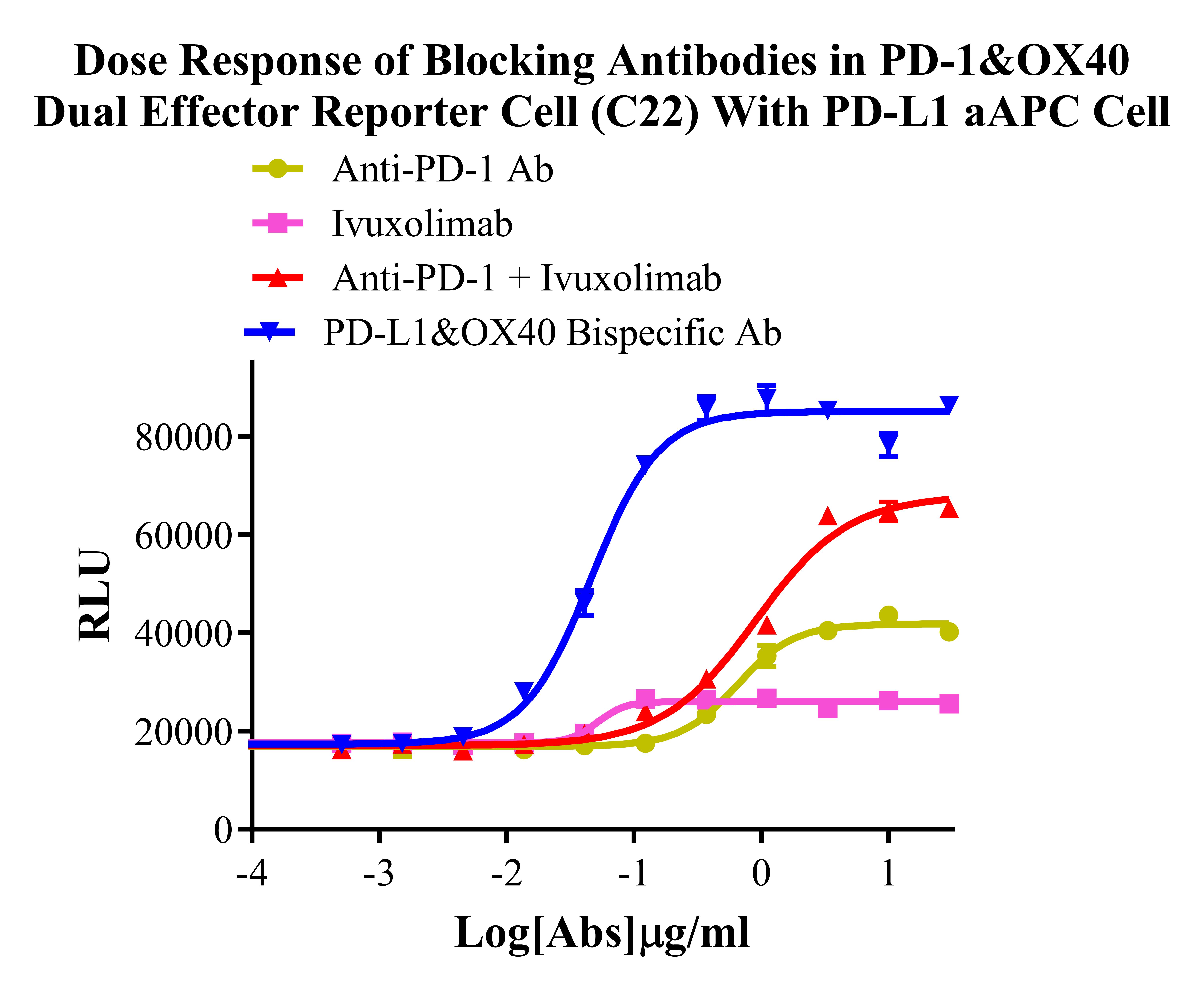 Figure 4. Dose Response of Blocking Antibodies in PD-1&OX40 Dual Effector Reporter Cells (C22) With PD-L1 aAPC Cells.