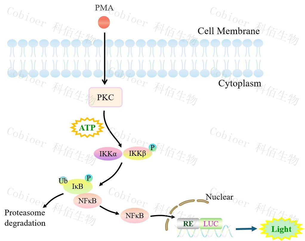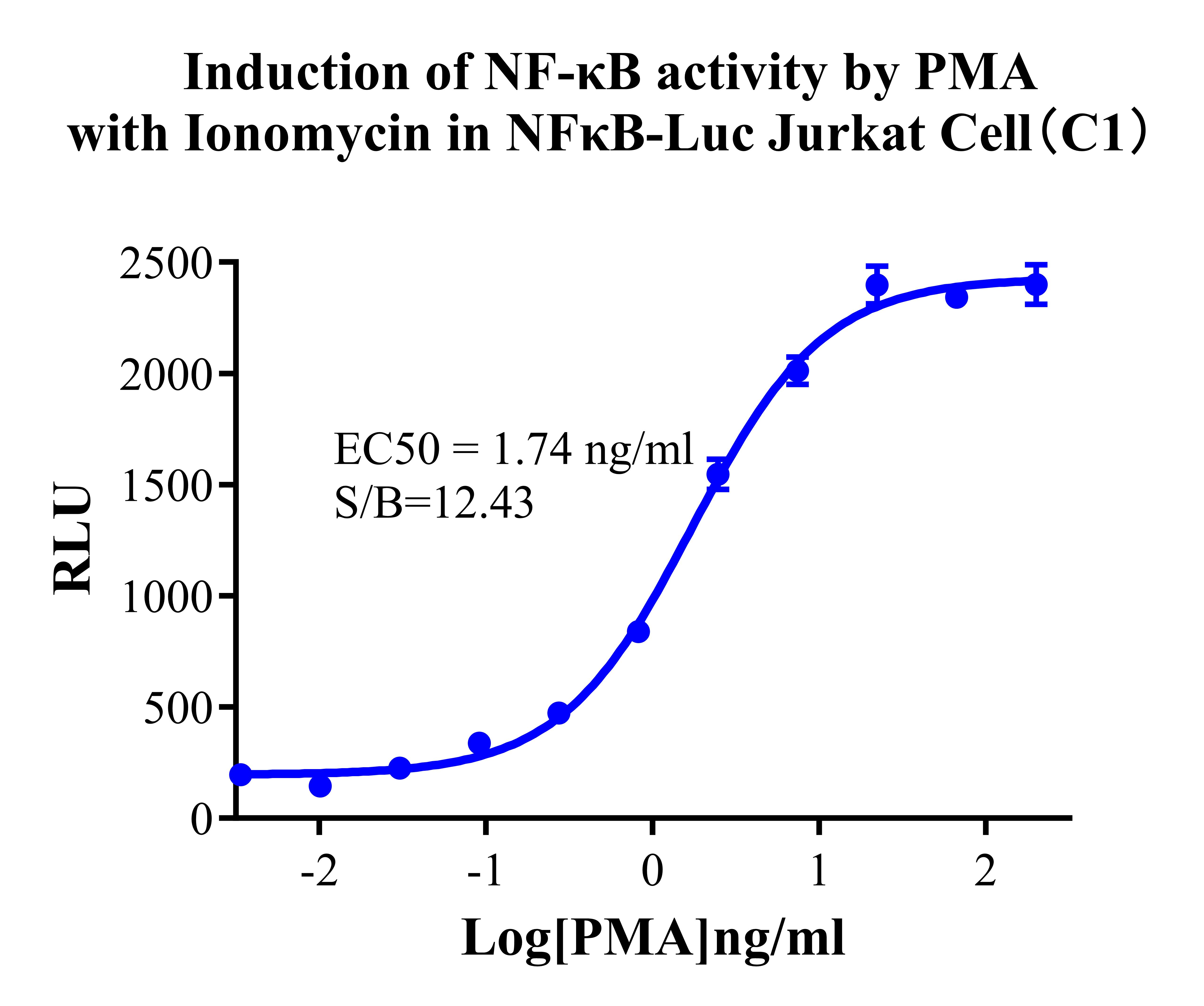 NFκB-Luc Jurkat 報(bào)告基因細(xì)胞是由 NFκB 調(diào)控并表達(dá) Luc 熒光素酶報(bào) 告基因的 Jurkat細(xì)胞。PMA 是 DAG(二酯酰甘油)的類似物,可自由的通過細(xì)胞膜,直接 作用于細(xì)胞活化信號(hào)轉(zhuǎn)導(dǎo)通路上的 PKC,原理見下圖所示。![]() Figure 1:NFκB-Luc Jurkat 細(xì)胞模型原理圖