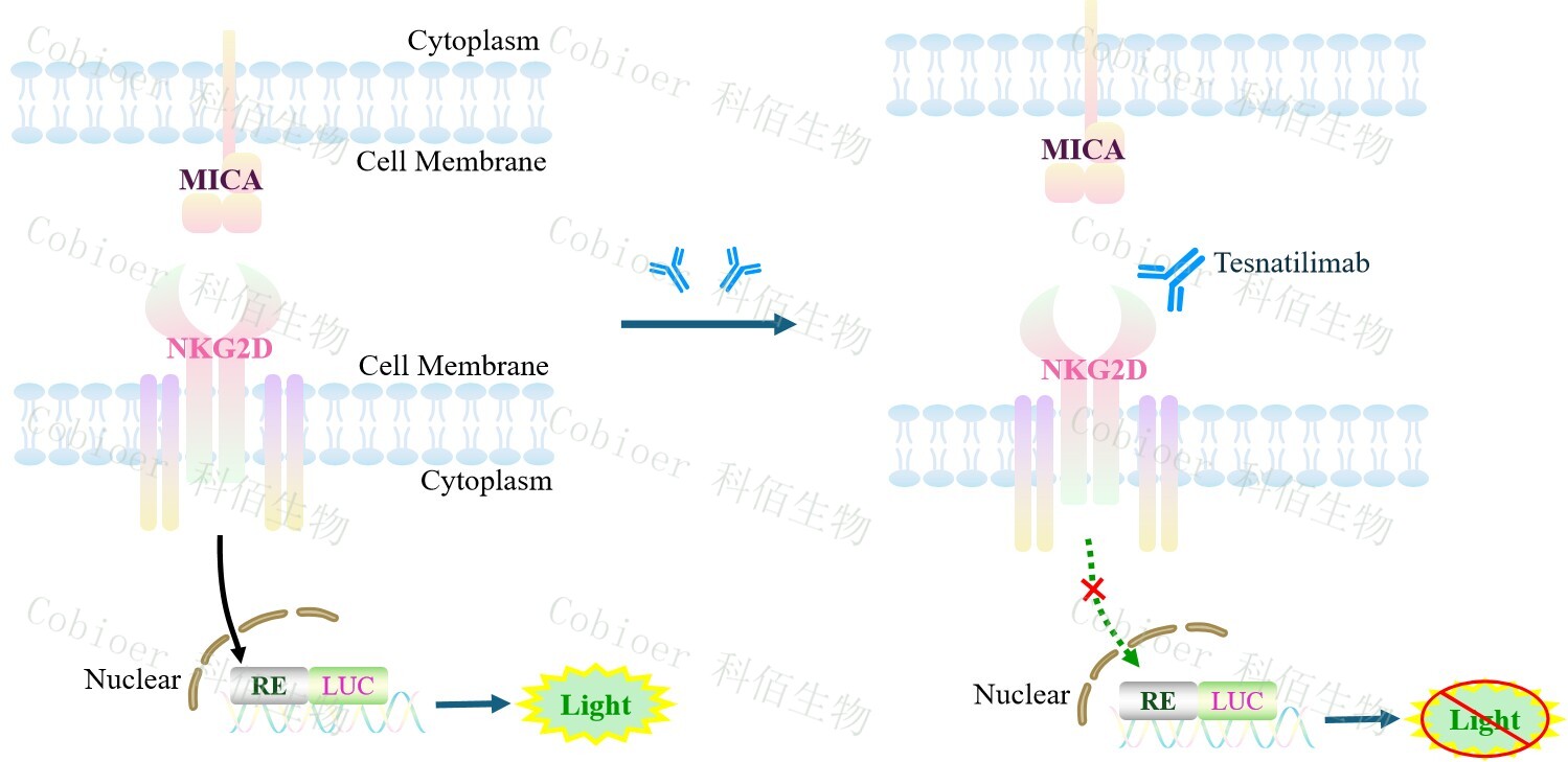 MICA CHO 作為 NKG2D Effector Reporter Cell 的靶細(xì)胞,很好的模擬了體內(nèi) NKG2D 的信號(hào)轉(zhuǎn)導(dǎo)過程,原理見下圖所示。![]() Figure 1. MICA CHO 細(xì)胞構(gòu)建原理圖 |