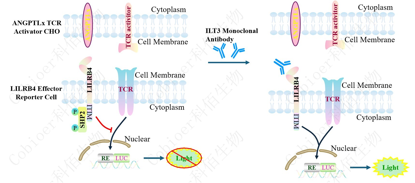 ANGPTLx TCR Activator CHO 作為 LILRB4 Effector Reporter Cell 的靶細(xì)胞,很好的模 擬了體內(nèi) LILRB4 的信號(hào)轉(zhuǎn)導(dǎo)過(guò)程,原理見(jiàn)下圖所示。![]() Figure 1. ANGPTLx TCR Activator CHO 模型原理圖 |
