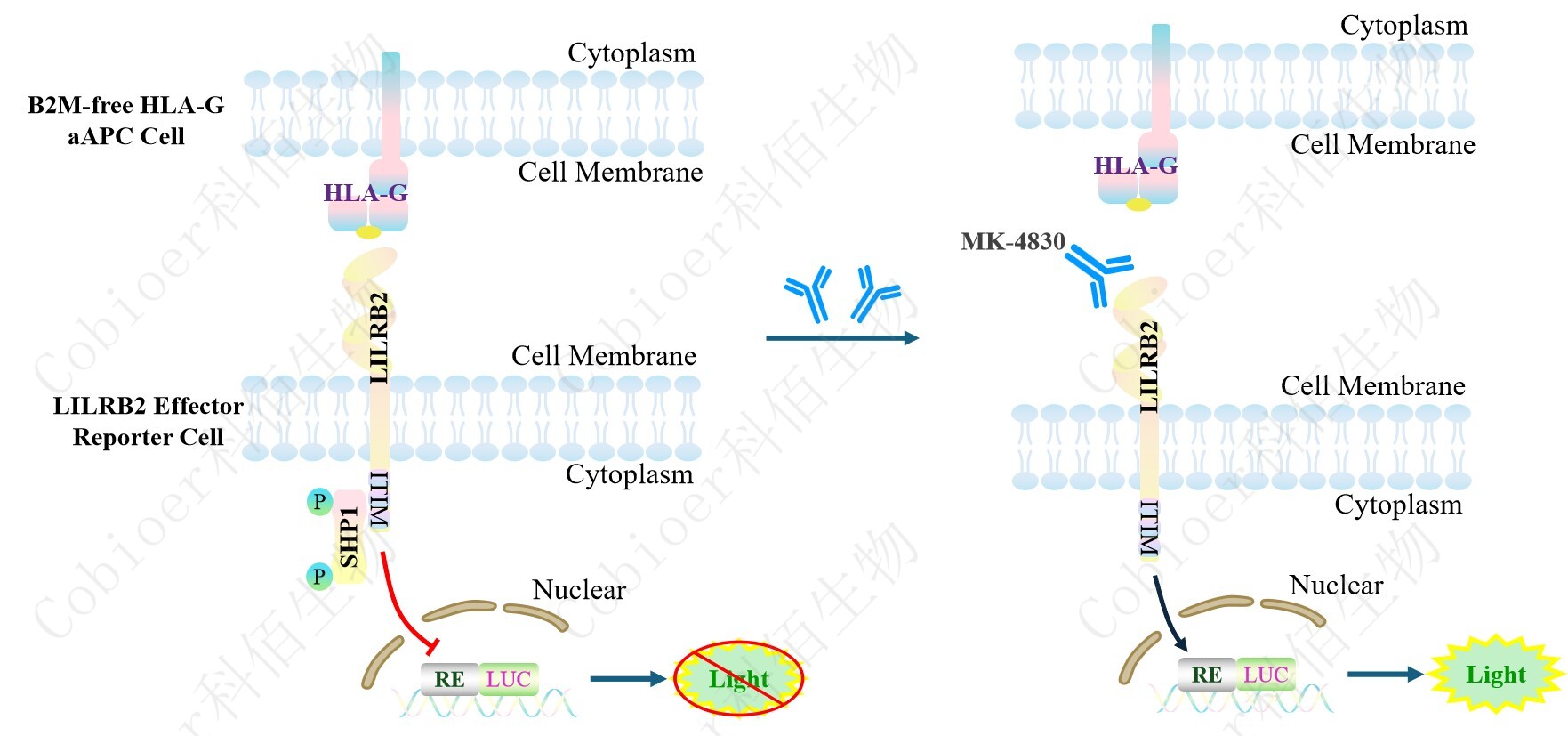 LILRB2 Effector Reporter Cell 報(bào)告基因藥靶模型很好的模擬了體內(nèi) LILRB2 的信號(hào)轉(zhuǎn) 導(dǎo)過程,原理見下圖所示。![]() ![]() Figure 1. LILRB2 Effector Reporter Cell 模型原理圖 |