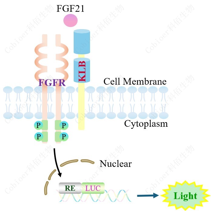 KLB Effector Reporter Cell 報告基因藥靶模型很好的模擬了體內(nèi) KLB 的信號轉(zhuǎn)導(dǎo)過程, 原理見下圖所示。 ![]() Figure 1. KLB Effector Reporter Cell 細胞模型原理圖