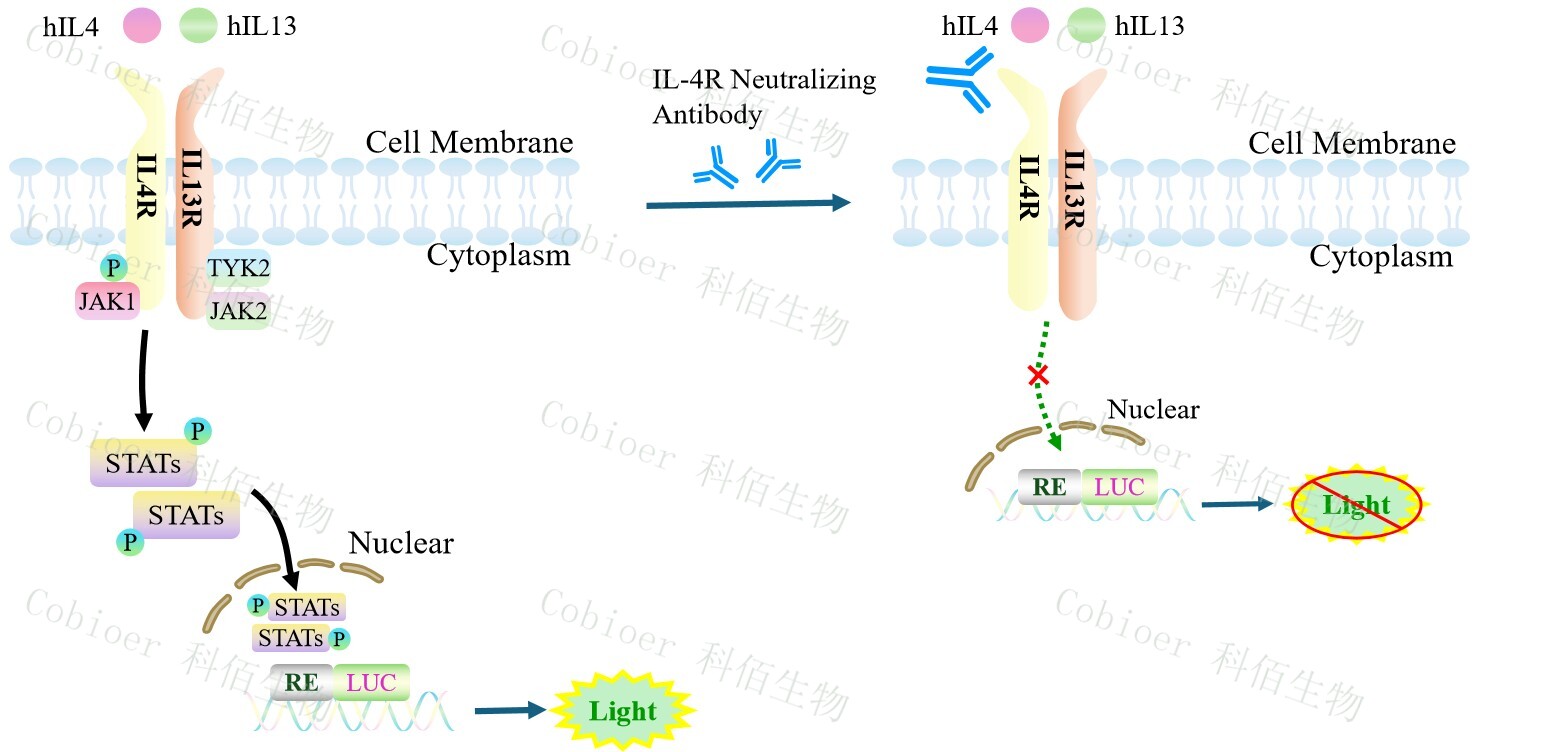 IL4/IL13 Effector Reporter Cell 報告基因藥靶模型很好的模擬了體內(nèi) IL4/IL13 的信號轉(zhuǎn) 導過程,原理見下圖所示。