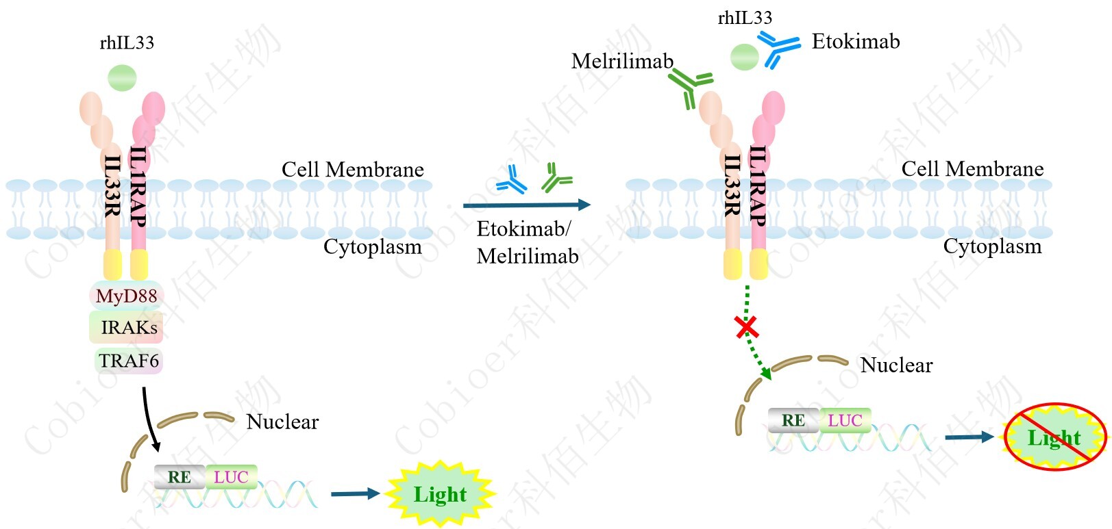 IL33 Effector Reporter Cell 報告基因藥靶模型很好的模擬了體內(nèi) IL33 的信號轉(zhuǎn)導(dǎo)過程, 原理見下圖所示。 Figure 1. IL33 Effector Reporter Cell 細(xì)胞模型原理圖 |