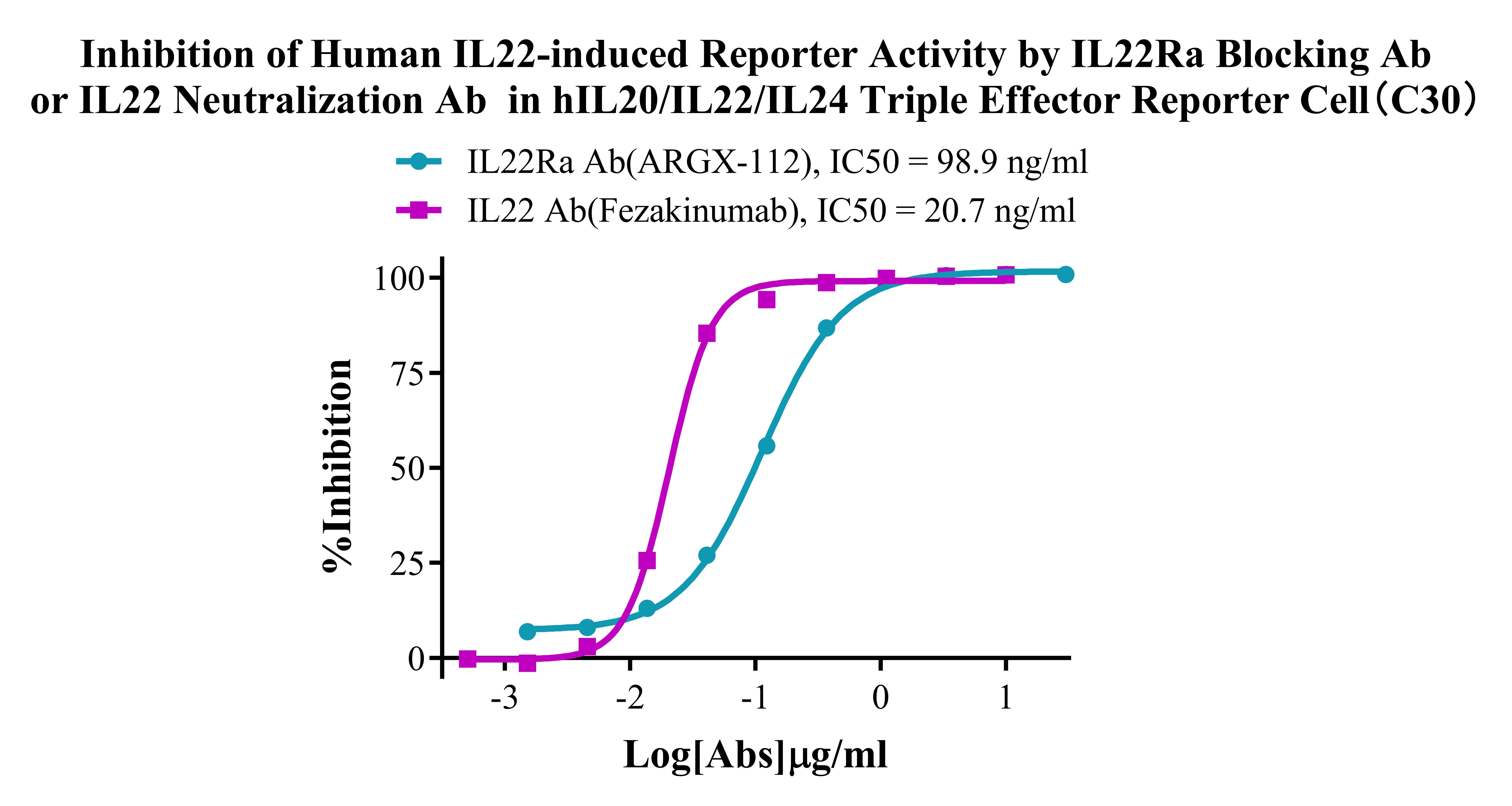 Figure 4. Inhibition of Human lL22-induced Reporter Activity by lL22Ra Blocking Ab or lL22 Neutralization Ab in hIL20/IL22/IL24 Triple Effector Reporter Cell(C30).