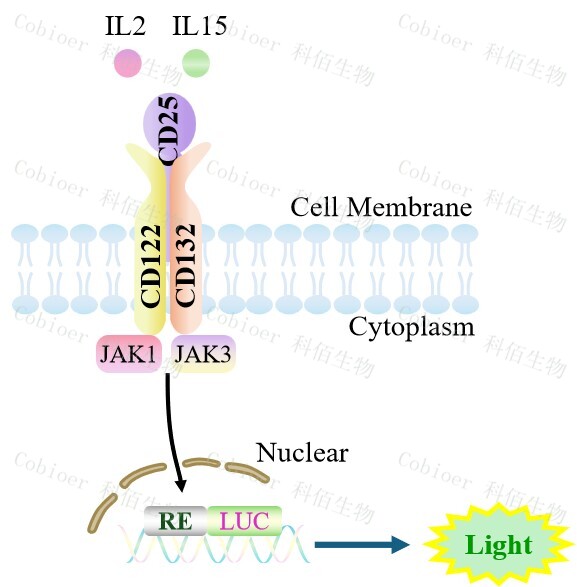 hIL2/IL15(hCD25 hCD122 hCD132)Effector Reporter Cell 報告基因藥靶模型很好的模擬了體內(nèi) IL2 受體三亞基的信號轉(zhuǎn)導(dǎo)過程,原理見下圖所示。