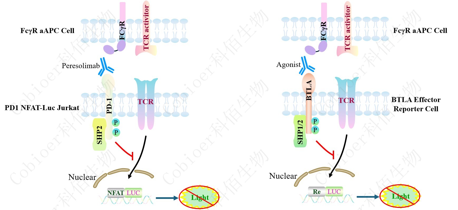FcγR aAPC Cell在基礎(chǔ)細(xì)胞上穩(wěn)定表達(dá) FcγR 和 aAPC。FcγR aAPC Cell 作為 PD1 NFAT-Luc Jurkat Cell/BTLA Effector Reporter Cell 的靶細(xì)胞進行功能檢測的原 理圖見下圖所示。![]() Figure 1. FcγR aAPC Cell 的原理圖 |