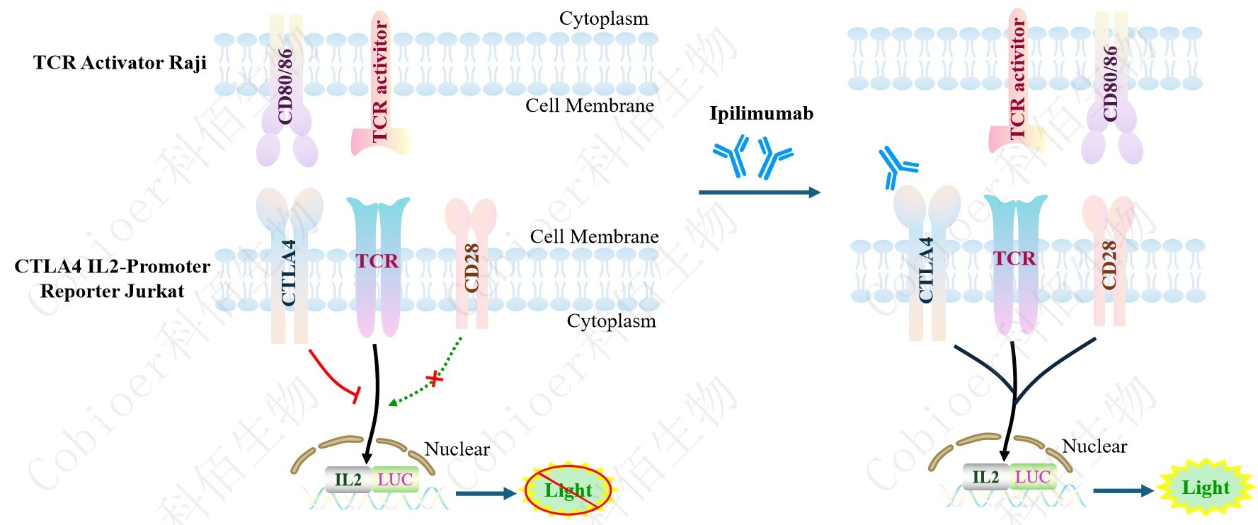 CTLA4 IL2-Promoter Reporter Jurkat 報告基因藥靶模型很好的模擬了體內(nèi) CTLA4&IL2 的信號轉(zhuǎn)導(dǎo)過程,原理見下圖所示。![]() Figure 1. CTLA4 IL2-Promoter Reporter Jurkat 細胞模型原理圖 |