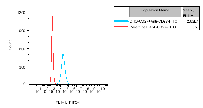 Figure 1. Recombinant CHO cell line expressing full length human CD27 (TNFRSF7). Expression is confirmed by flow cytometry. |
