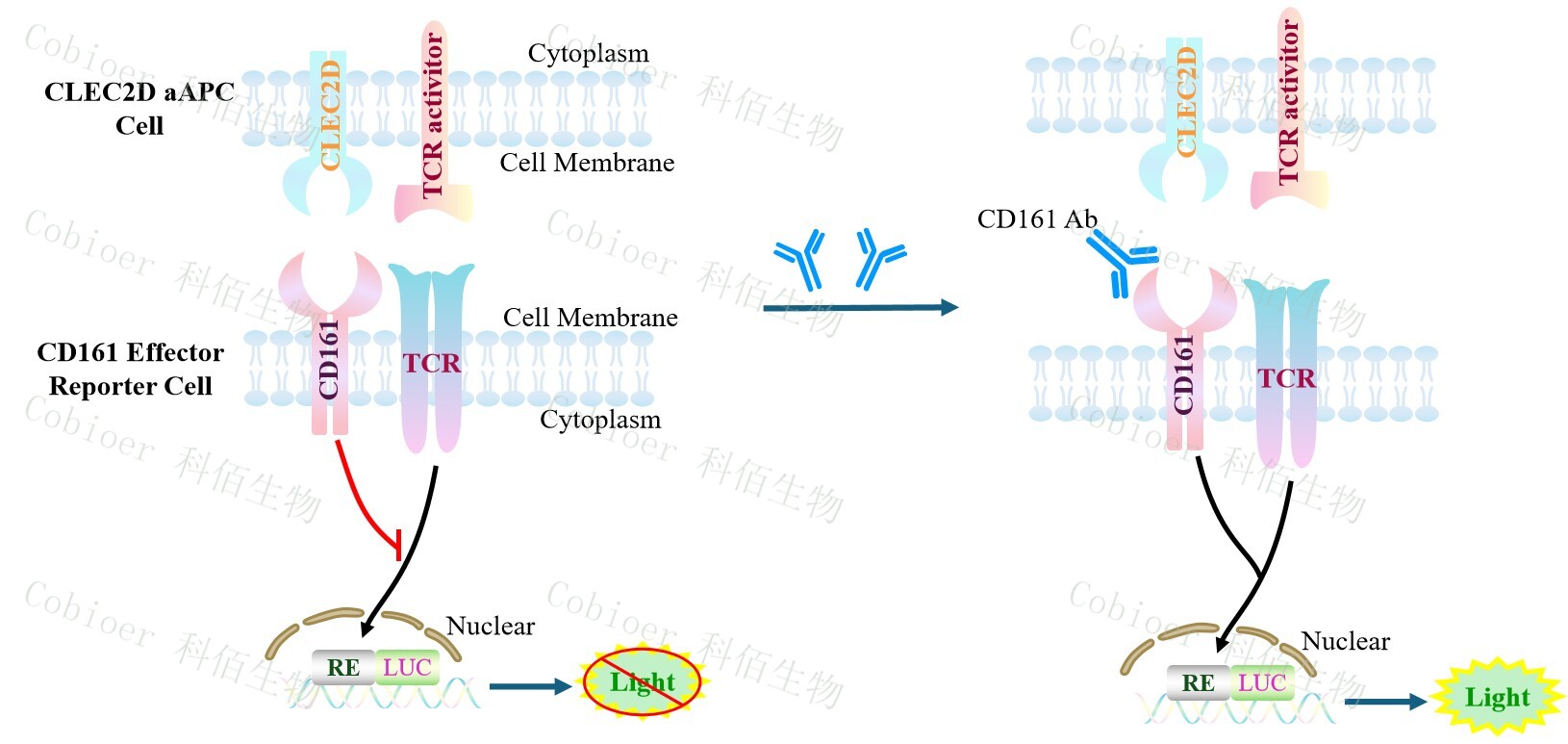 CLEC2D aAPC Cell 報告基因藥靶模型很好的模擬了體內(nèi) CD161/CLEC2D 的信號轉(zhuǎn)導(dǎo)過程,原理見下圖所示。![]() Figure 1. CLEC2D aAPC Cell 細(xì)胞模型原理圖 |