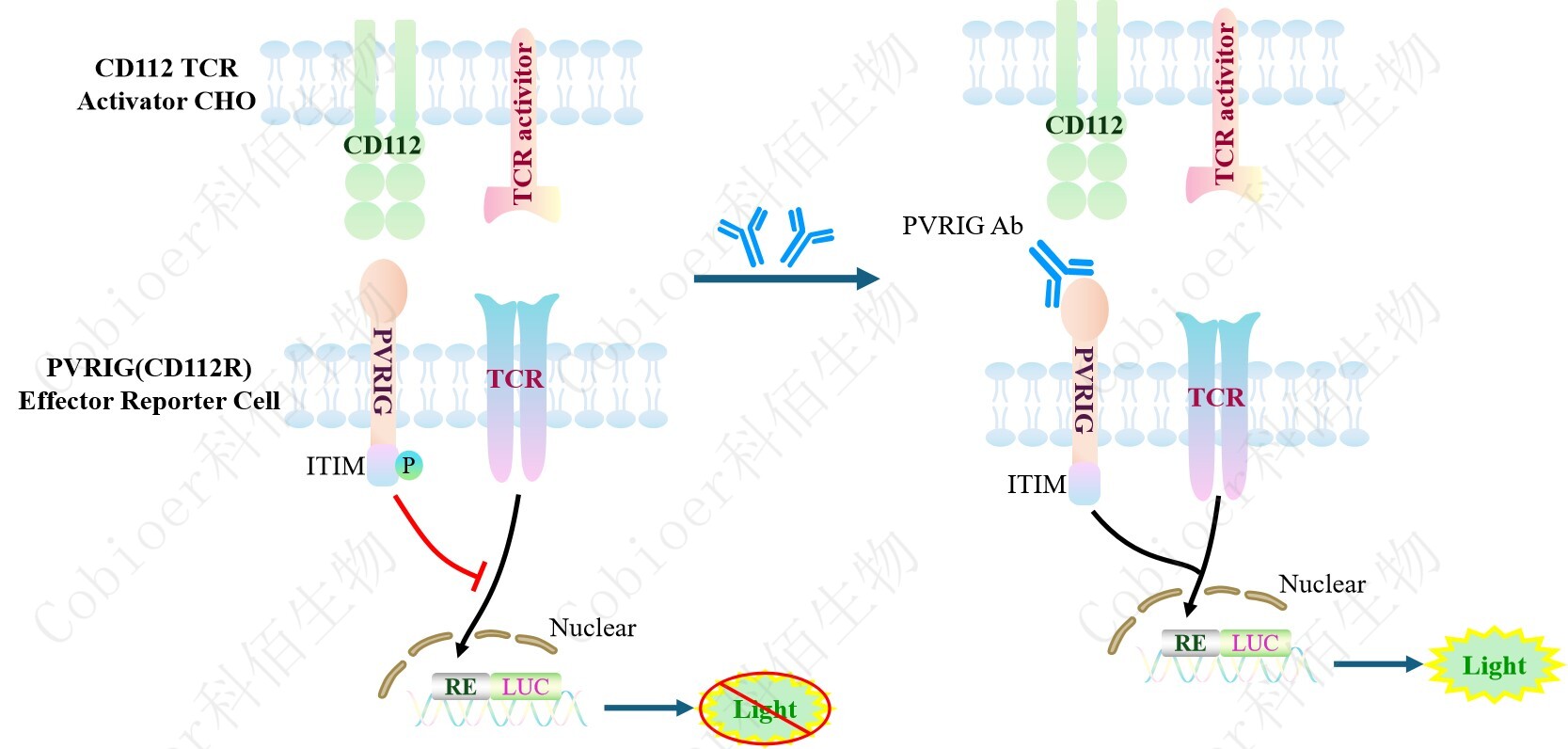 CD112 TCR Activator CHO 細(xì)胞作為 PVRIG(CD112R) Effector Reporter Cell 的靶細(xì)胞, 很好的模擬了體內(nèi) PVRIG(CD112R) 的信號(hào)轉(zhuǎn)導(dǎo)過(guò)程,原理見下圖所示。