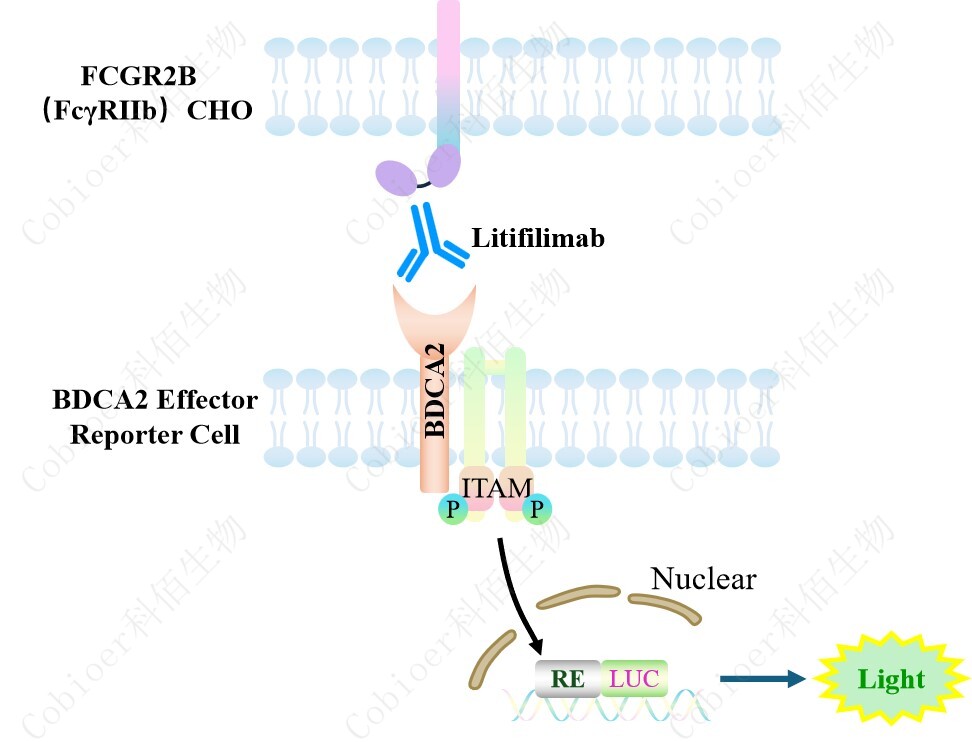 BDCA2 Effector Reporter 報(bào)告基因藥靶模型很好的模擬了體內(nèi) BDCA2 的信號(hào)轉(zhuǎn)導(dǎo)過(guò)程, 原理見(jiàn)下圖 所示。![]() Figure 1. BDCA2 Effector Reporter 細(xì)胞模型原理圖
