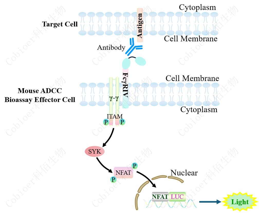 Mouse ADCC Bioassay Effector Cell 報(bào)告基因藥靶模型很好的模擬了體內(nèi) ADCC 的信號(hào)轉(zhuǎn)導(dǎo)過程,原理見下圖所示。