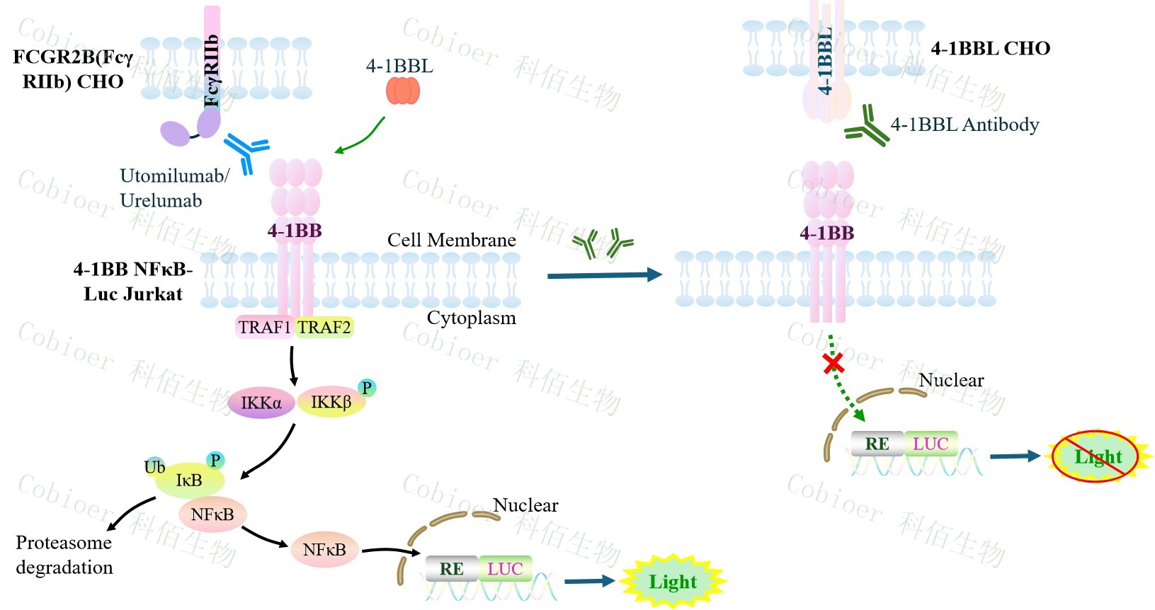 4-1BB NFκB-Luc Jurkat 報告基因藥靶模型很好的模擬了體內(nèi) 4-1BB 的信號轉(zhuǎn)導過程, 原理見下圖所示。