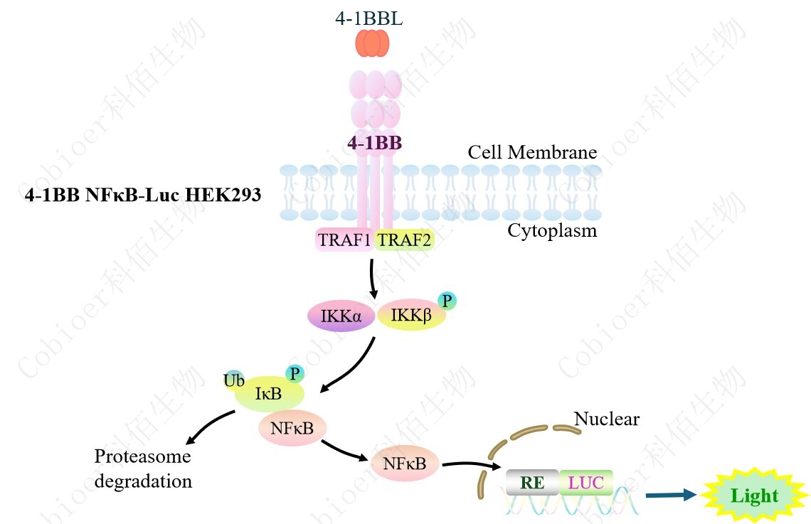 4-1BB NFκB-Luc HEK293 報告基因藥靶模型很好的模擬了體內(nèi) 4-1BB 的信號轉導過程, 原理見下圖所示。 Figure 1. 4-1BB NFκB-Luc HEK293 細胞模型原理圖