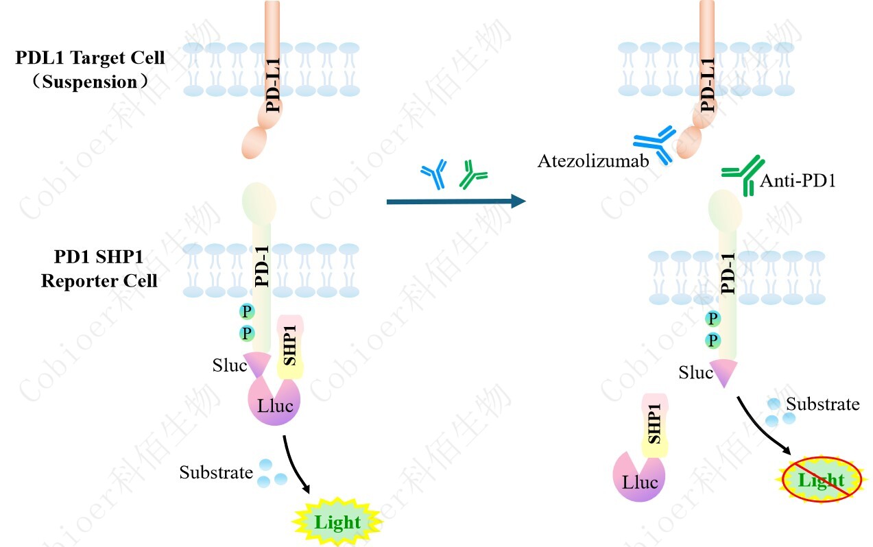 PD1 SHP1 Reporter Cell 報(bào)告基因藥靶模型很好的模擬了體內(nèi) PD1/SHP1 的信號(hào)轉(zhuǎn)導(dǎo)過 程,原理見下圖所示。![]() Figure 1. PD1 SHP1 Reporter Cell 細(xì)胞模型原理圖 |