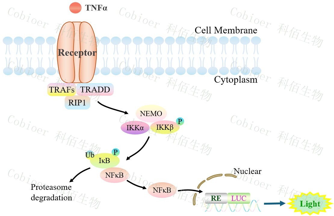 NFκB-Luc THP-1 報告基因細(xì)胞是由 NFκB 調(diào)控并表達(dá) Luc 熒光素酶報 告基因的 THP-1 細(xì)胞。TNFα 與受體結(jié)合,激活 NF-κB 的原理見下圖所示。![]() Figure 1. NFκB-Luc THP-1 細(xì)胞模型原理圖