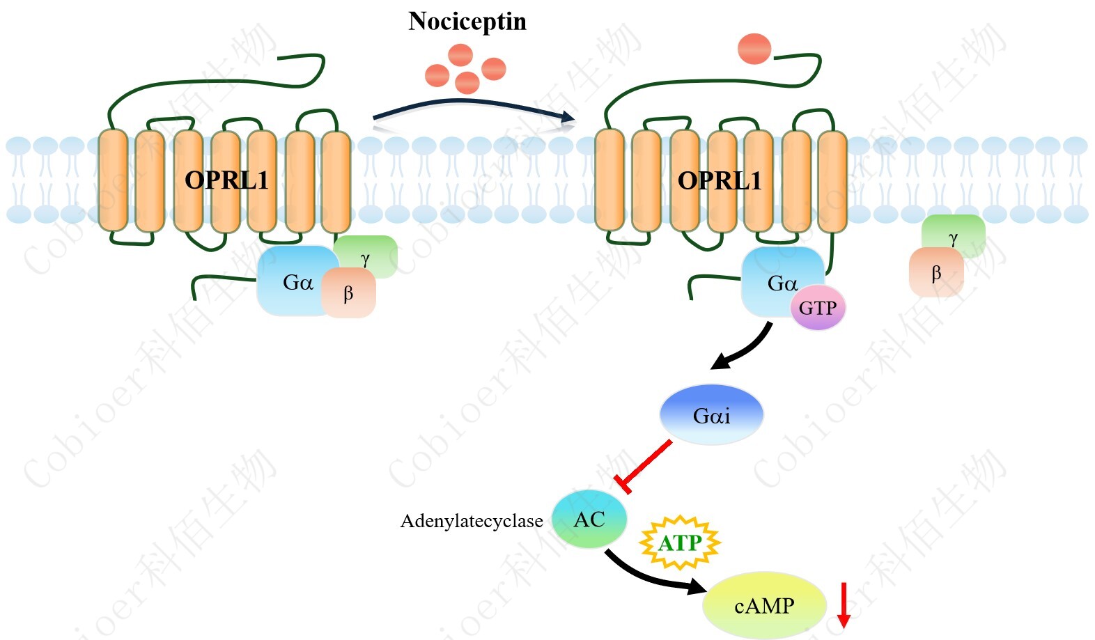 cAMP 在 G 蛋白偶聯(lián)受體(GPCR)信號轉導中是一種關鍵的第二信使。當配體結合到 GPCR,構象發(fā)生變化,激活受體接著激活 G 蛋白,Gi 的激活導致腺苷酸環(huán)化酶調(diào)控 cAMP 的下調(diào)。OPRL1 CHO 藥靶模型很好的模擬了體內(nèi) OPRL1 的信號轉導過程,原理見下圖所示。 |
