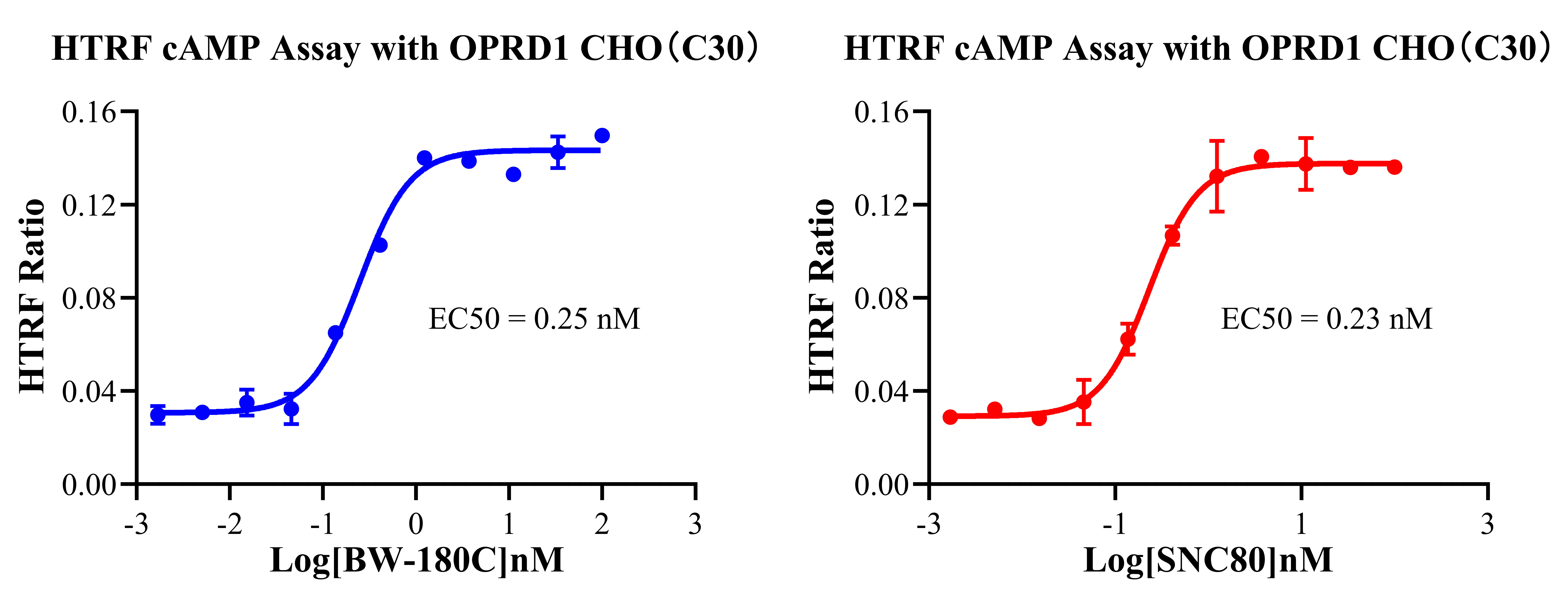 cAMP 在 G 蛋白偶聯(lián)受體(GPCR)信號轉導中是一種關鍵的第二信使。當配體結合到 GPCR,構象發(fā)生變化,激活受體接著激活 G 蛋白,Gi 的激活導致腺苷酸環(huán)化酶調控 cAMP 的下調。OPRD1 CHO 藥靶模型很好的模擬了體內 OPRD1 的信號轉導過程,原理見下圖所示。 |