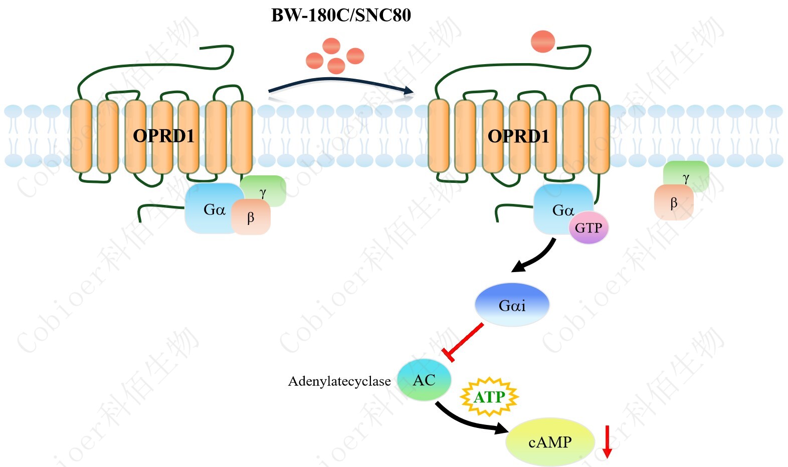 阿片受體家族包括κ-阿片受體(KOP)、 δ-阿片受體(DOP)、µ-阿片受體(MOP) 和痛覺肽阿片受體(NOP),均屬于 G 蛋白偶聯(lián)受體,主要通過偶聯(lián)下游 Gi 蛋白發(fā)揮功 能。OPRD1 是一種 G 蛋白偶聯(lián)受體,作為內源性腦啡肽和其他阿片亞群的受體。配體結合 引起構象改變,通過鳥嘌呤核苷酸結合蛋白(G 蛋白)觸發(fā)信號,并調節(jié)下游效應物(如腺苷 酸環(huán)化酶)的活性。信號傳導導致腺苷酸環(huán)化酶活性的抑制。它通過減少鈣離子電流和增加 鉀離子電導來抑制神經遞質釋放。它在疼痛的感知和阿片介導的鎮(zhèn)痛中起作用。 |