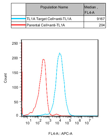 IV. Representative Data![]() Figure 2. Recombinant TL1A Target Cell stably expressing TL1A. ![]() Figure 3. Blocking of hTLlA induced DR3 Effector Reporter Cells(C15) Activity by TLlA Neutralizaiton Abs with TL1A Target Cell. |