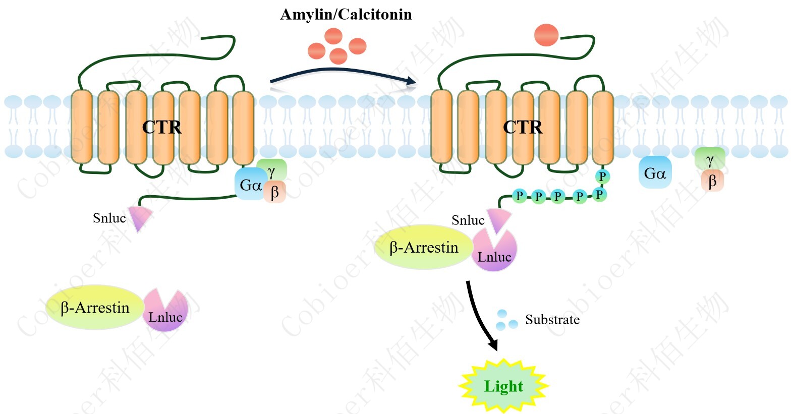 CTR β-Arrestin CHO 報(bào)告基因藥靶模型很好的模擬了體內(nèi) CTR/β-Arrestin 的信號(hào)轉(zhuǎn)導(dǎo)過(guò)程,原理見下圖所示。當(dāng)缺乏配體刺激時(shí),β-Arrestin 不與 CTR 結(jié)合,融合β-Arrestin 的 熒光素酶處于失活構(gòu)象;當(dāng) CTR 遭遇配體刺激時(shí),融合熒光素酶報(bào)告基因的β-Arrestin 被招募,使熒光素酶報(bào)告基因處于激活狀態(tài),加入其底物后發(fā)光信號(hào)增強(qiáng)。 |