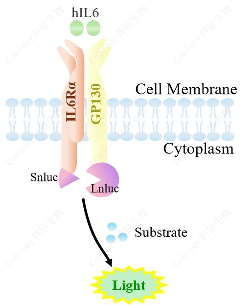IL6RA&IL6ST Dimerization CHO 報告基因藥靶模型很好的模擬了體內(nèi) IL6 的信號轉(zhuǎn)導(dǎo)過程,原理見下圖所示。