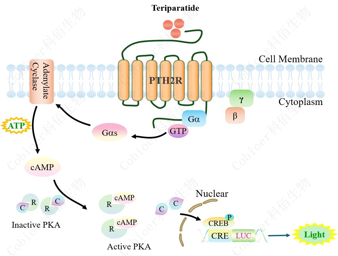 PTH2R CRE-Luc HEK293 報告基因藥靶模型很好的模擬了體內(nèi) PTH2R 的信號轉(zhuǎn)導(dǎo)過 程,原理見下圖所示。 ![]() Figure 1. PTH2R CRE-Luc HEK293 細(xì)胞模型原理圖 |