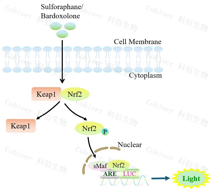 ARE-Luc MCF7 報告基因細胞,是由 ARE 調(diào)控并表達 Luc 熒光素酶報 告基因的 MCF7 細胞。Sulforaphane 是 Keap1/Nrf2/ARE 的誘導(dǎo)劑,Bardoxolone 是 NRf2 的 激活劑,原原理見下圖所示。![]() |