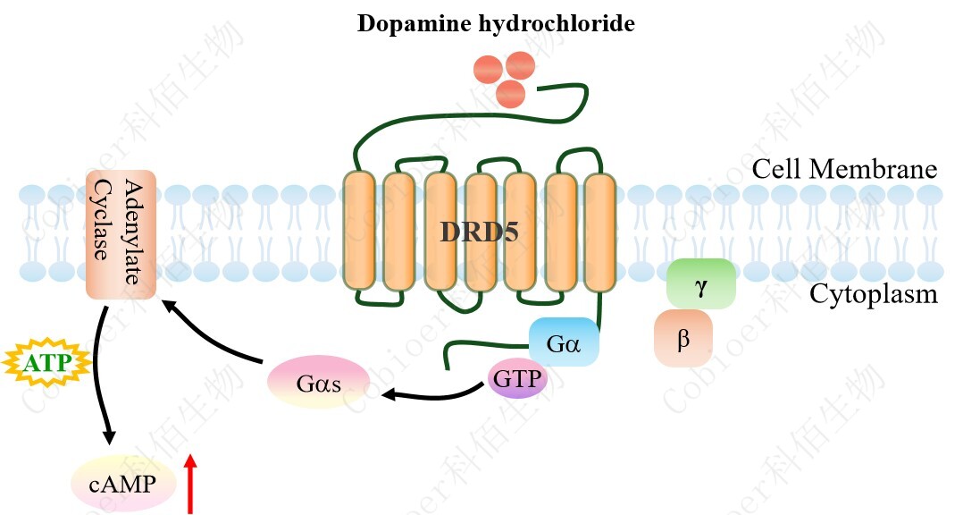 cAMP 在 G 蛋白偶聯(lián)受體(GPCR)信號轉導中是一種關鍵的第二信使。當配體結合 到 GPCR,構象發(fā)生變化,激活受體接著激活 G 蛋白,Gs 的激活導致腺苷酸環(huán)化酶調(diào)控 cAMP 的升高。DRD5 CHO 藥靶模型很好的模擬了體內(nèi) DRD5 的信號轉導過程,原理見下圖所 示。