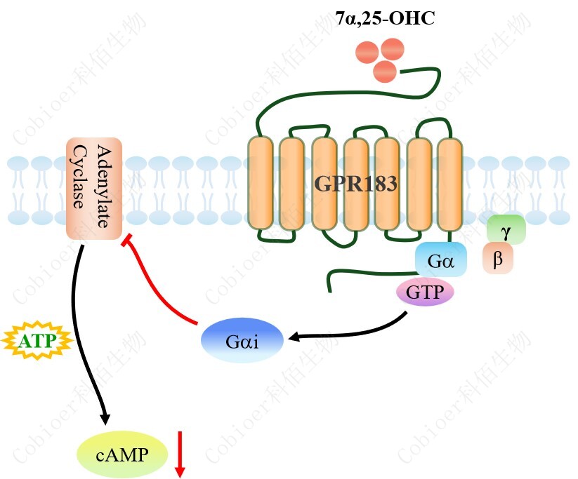 cAMP 在 G 蛋白偶聯(lián)受體(GPCR)信號轉(zhuǎn)導(dǎo)中是一種關(guān)鍵的第二信使。當(dāng)配體結(jié)合 到 GPCR,構(gòu)象發(fā)生變化,激活受體接著激活 G 蛋白,Gi 的激活導(dǎo)致腺苷酸環(huán)化酶調(diào)控 cAMP 的下調(diào)。GPR183(EBI2) CHO 藥靶模型很好的模擬了體內(nèi) GPR183(EBI2)的信號轉(zhuǎn)導(dǎo)過程,原理見下圖所示。