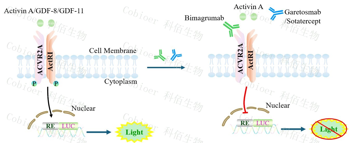 ACVR2A Effector Reporter Cell 報告基因藥靶模型很好的模擬了體內(nèi) ACVR2A 的信號 轉(zhuǎn)導過程,原理見下圖所示。