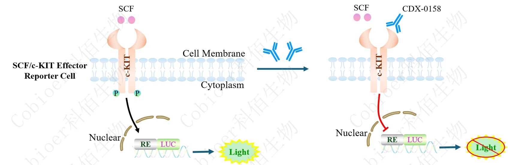 SCF/c-KIT Effector Reporter Cell 報告基因藥靶模型很好的模擬了體內 SCF/c-KIT 的信號轉導過程,原理見下圖所示。