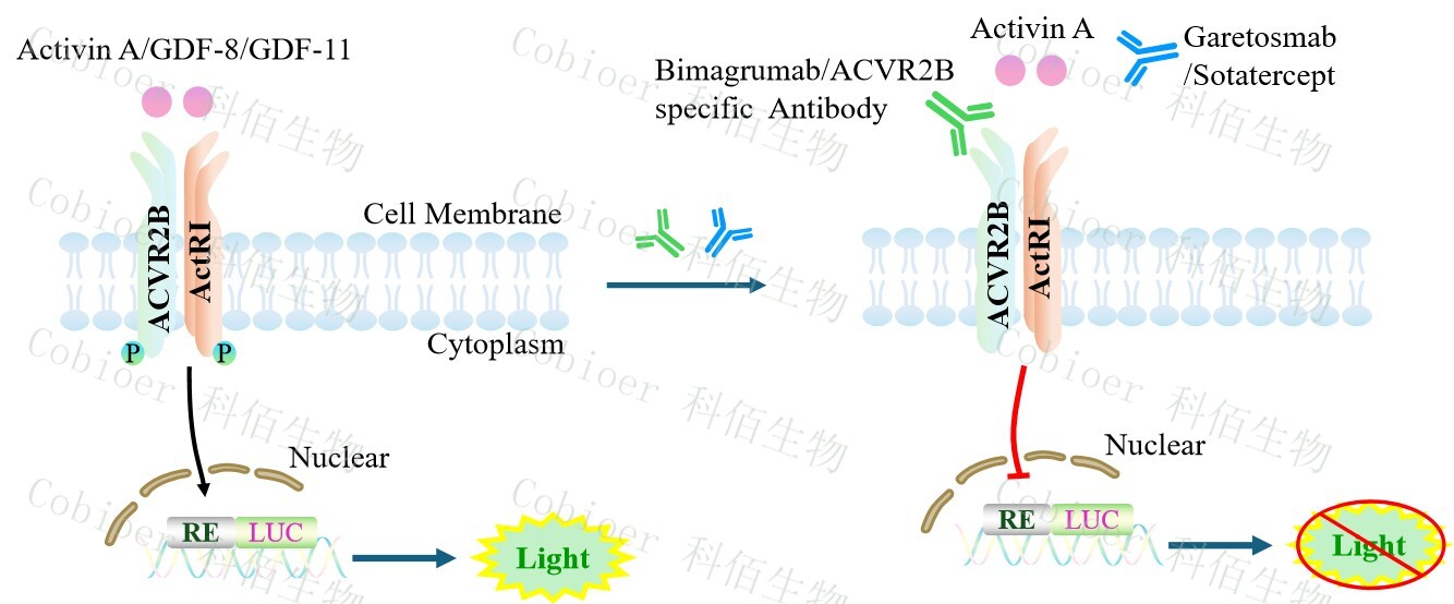 ACVR2B Effector Reporter Cell 報(bào)告基因藥靶模型很好的模擬了體內(nèi) ACVR2A 的信號(hào)轉(zhuǎn)導(dǎo)過程,原理見圖 所示。