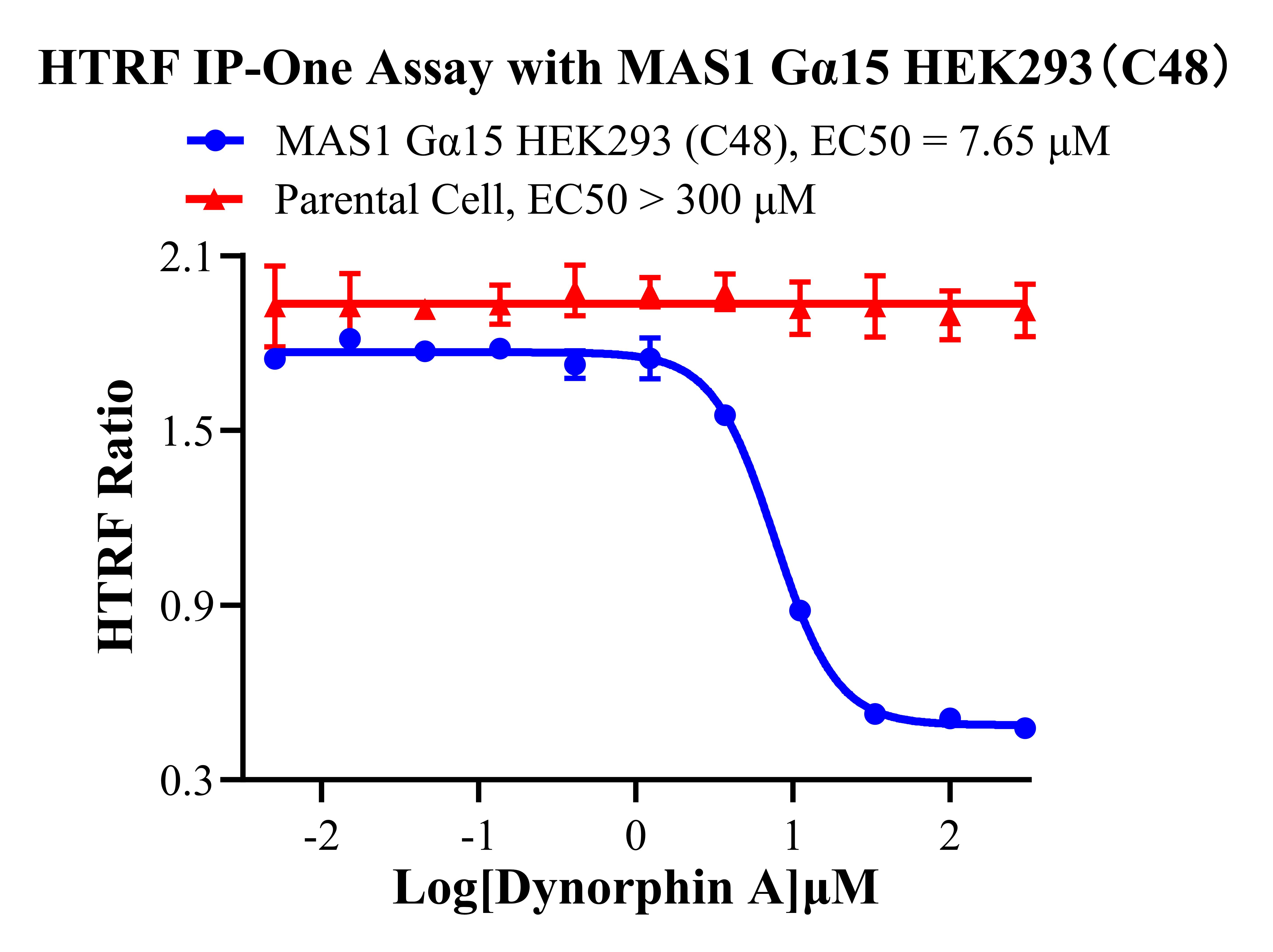 MAS1 可以通過 Gq 蛋白的信號通路,調(diào)控 IP1 的升高。MAS1 與配體結(jié)合,導(dǎo)致 Gαq 亞基的激活,觸發(fā) PLC-γ,從而產(chǎn)生兩個(gè)第二信使:IP3 和 DAG,它們參與細(xì)胞內(nèi)鈣動(dòng)員。 由于 IP3 在代謝上不穩(wěn)定,因此測量通路激活的替代標(biāo)志物 IP1 作為檢測標(biāo)準(zhǔn)。