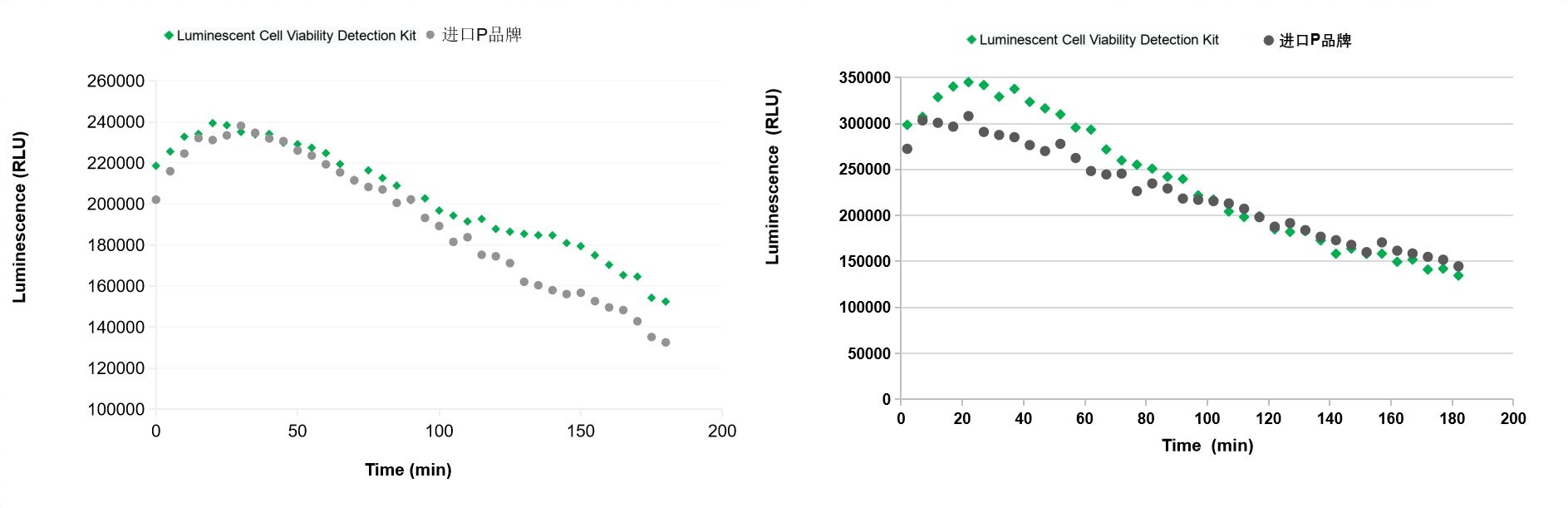 2. 半衰期 ![]() Figure 3. 生物發(fā)光穩(wěn)定性的檢測。分別使用Luminescent Cell Viability Detection Kit和進口P公司同類對照對2萬個/孔CTLL-2細(xì)胞(左圖)和5萬個/孔UC-MSC細(xì)胞(右圖)進行持續(xù)3小時的生物發(fā)光強度檢測。