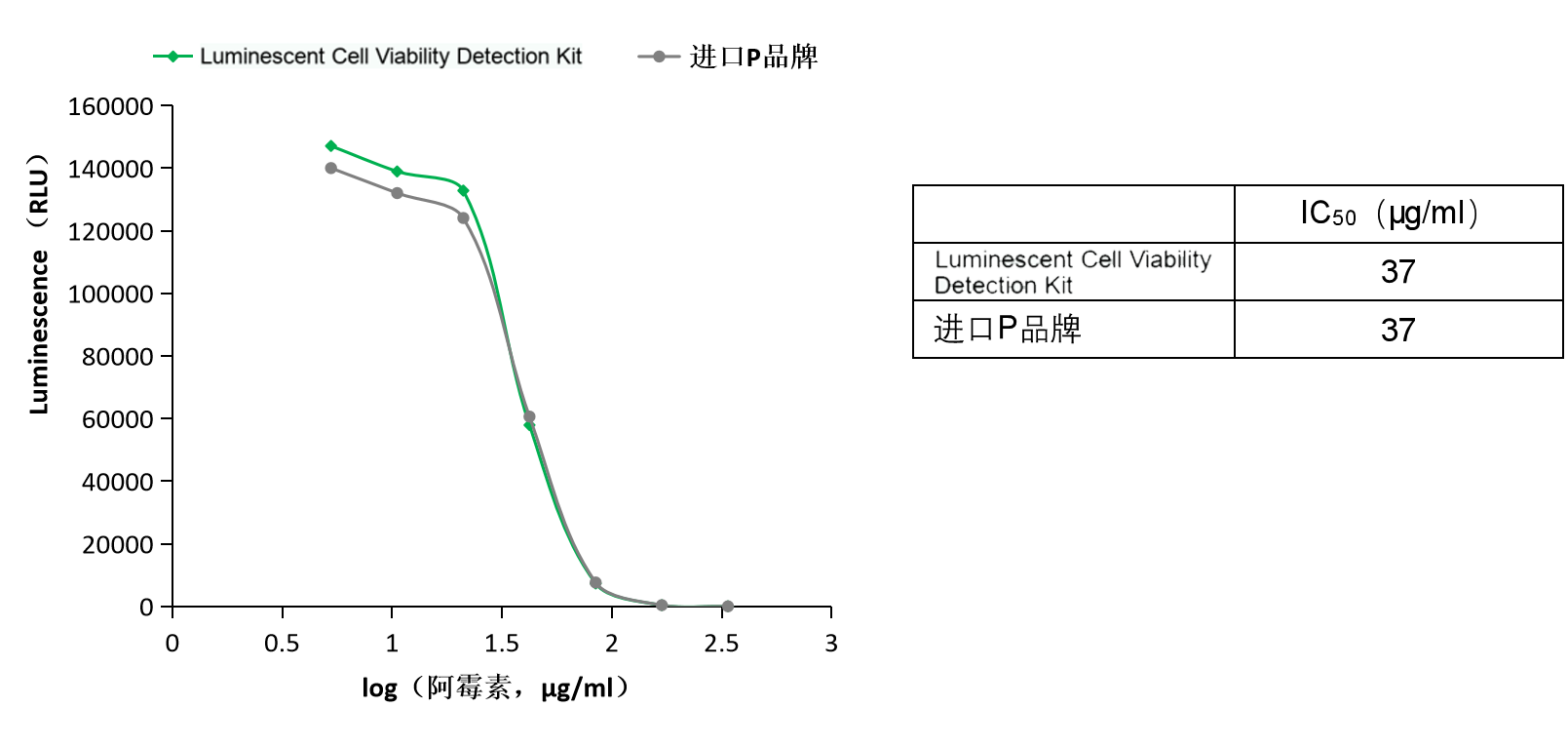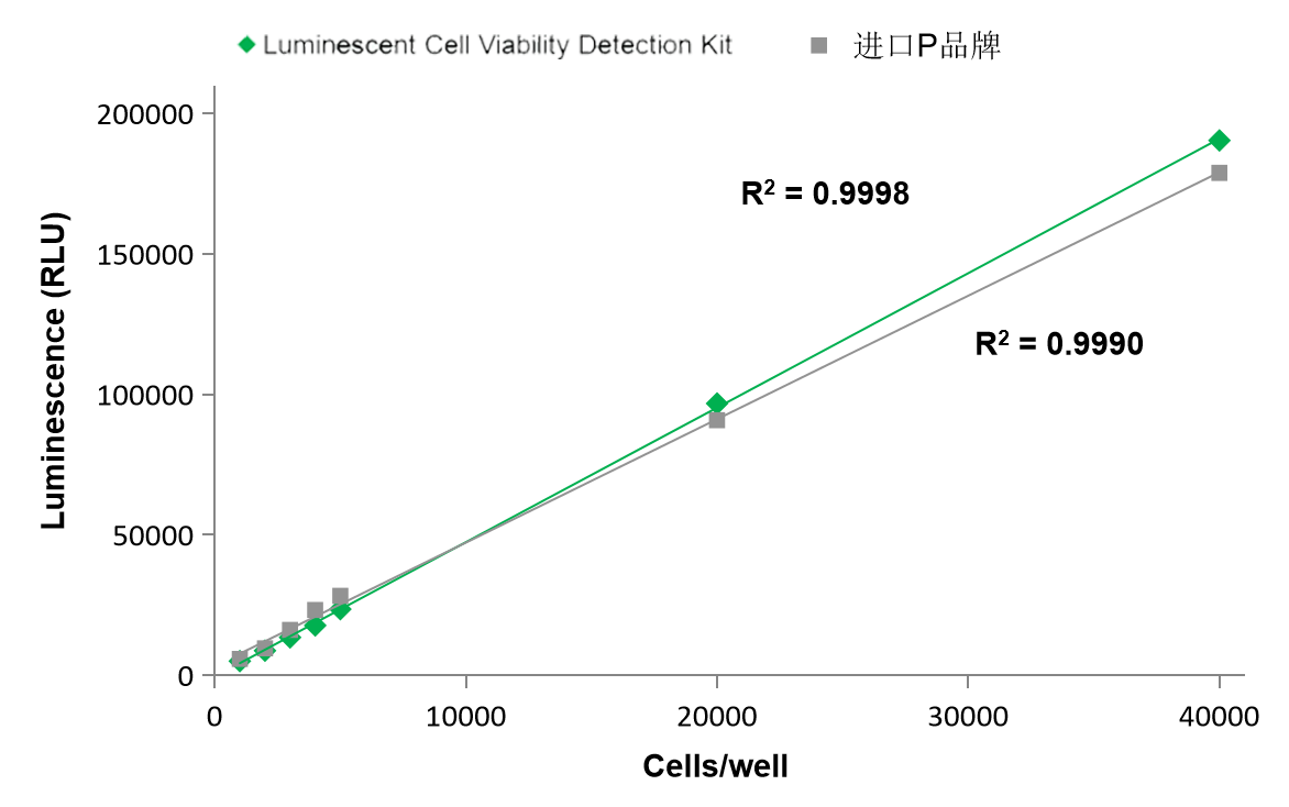 3. 線性 ![]() Figure 4. 比較不同細(xì)胞數(shù)的線性范圍。分別使用Luminescent Cell Viability Detection Kit和進口P公司同類對照檢測不同數(shù)量CHO-K1細(xì)胞(CD-CHO培養(yǎng)基)在黑色96孔板中生物發(fā)光強度,制成標(biāo)準(zhǔn)曲線。