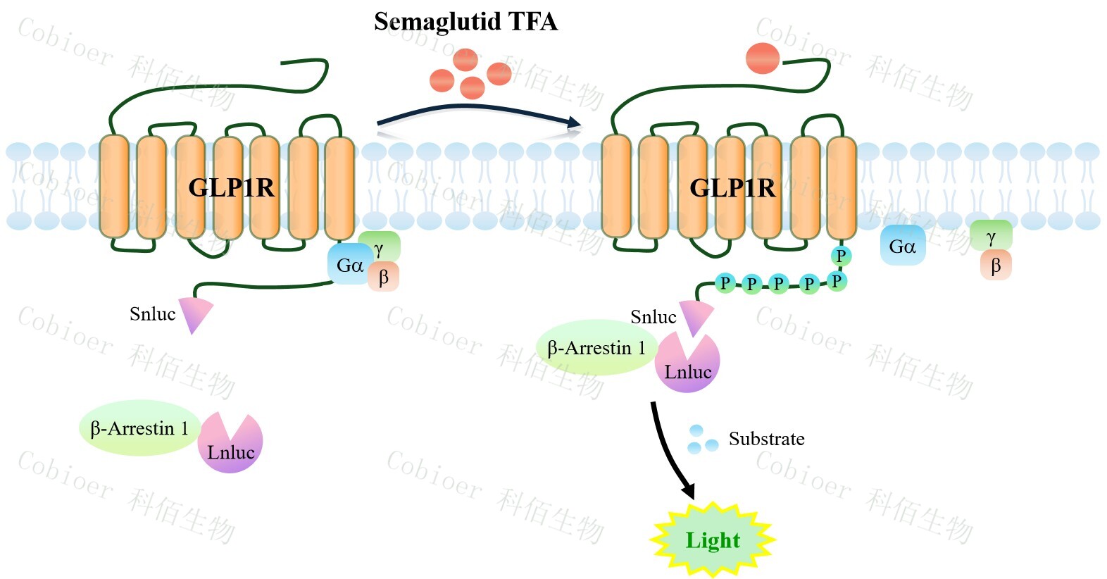 GLP1R β-Arrestin 1 CHO 報(bào)告基因藥靶模型很好的模擬了體內(nèi) GLP1R/β-Arrestin 1 的信 號(hào)轉(zhuǎn)導(dǎo)過(guò)程,原理見(jiàn)下圖所示。當(dāng)缺乏配體刺激時(shí),β-Arrestin 1 不與 GLP1R 結(jié)合,融合β- Arrestin 1 的熒光素酶處于失活構(gòu)象,當(dāng) GLP1R 遭遇配體刺激時(shí),融合熒光素酶報(bào)告基因 的β-Arrestin 1 被招募,使熒光素酶報(bào)告基因處于激活狀態(tài),加入其底物后發(fā)光信號(hào)增強(qiáng)。![]() Figure 1. GLP1R β-Arrestin 1 CHO 細(xì)胞模型原理圖 |
