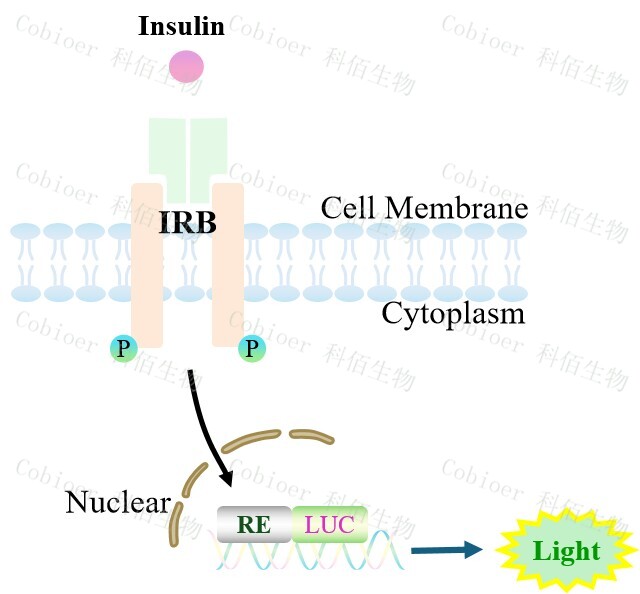 IRB Effector Reporter Cell 報告基因藥靶模型很好的模擬了體內(nèi) Insulin 的信號轉(zhuǎn)導過程, 原理見下圖所示。